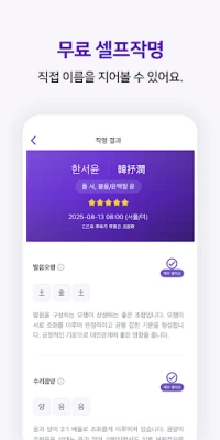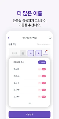 또한, "이름다움"은 전문가의 추천을 넘어 당신이 직접 이름을 만들어가는 즐거움까지 선사합니다. 성명학에 대한 깊은 지식이 없더라도, 직관적인 "셀프작명" 기능을 통해 자신만의 특별한 이름을 지을 수 있습니다. 출생 전 아기의 이름도 미리 지어볼 수 있으며, 제안된 모든 이름과 그 풀이는 결제 전 충분히 확인 가능하여 더욱 안심하고 이용할 수 있습니다. 마음에 드는 이름을 편리하게 저장하고, 작명 인증서를 PDF로 보관하는 기능은 이 중요한 여정의 아름다운 마무리를 돕습니다.