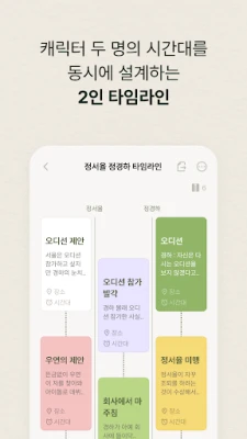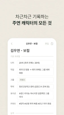 다수의 작품을 동시에 기획하고 관리하는 것은 더 이상 혼란스러운 작업이 아닙니다. 펜슬팜은 당신의 창작물이 서로 뒤섞이지 않도록 작품별 독립적인 공간을 제공하며, 불현듯 떠오른 영감을 놓치지 않도록 빠른 메모 기능을 지원합니다. 캐릭터의 성격과 배경, 핵심 사건의 흐름, 그리고 작품 전체의 시간 순서까지, 펜슬팜의 직관적인 인터페이스 안에서 모든 요소가 정돈되어 명확한 시야를 확보할 수 있습니다.