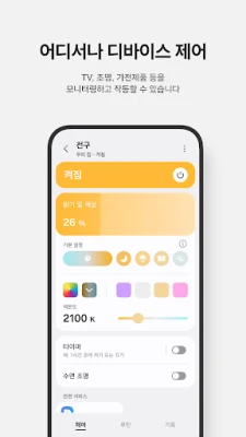 SmartThings와 함께라면, 당신의 집은 단순히 머무는 공간을 넘어, 당신의 라이프스타일에 맞춰 숨 쉬고 반응하는 스마트한 세상이 됩니다. 삼성 스마트 TV와 가전은 물론, 100여 개가 넘는 다양한 브랜드의 스마트 기기들을 SmartThings 하나의 앱으로 손쉽게 연결하고 통합 제어하세요. 복잡하게 흩어진 기기들을 번거롭게 관리할 필요 없이, 어디서든 빠르고 직관적으로 당신의 스마트 홈을 완벽하게 주도할 수 있습니다.